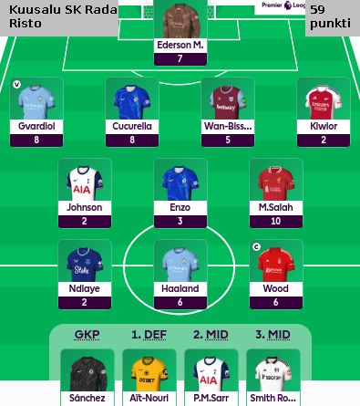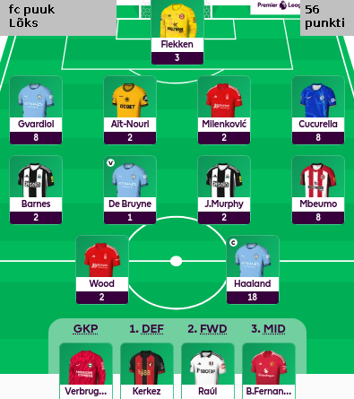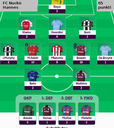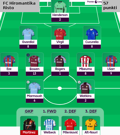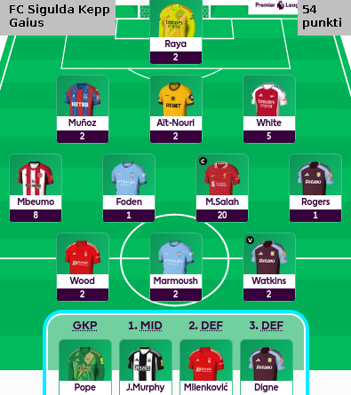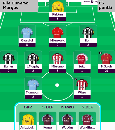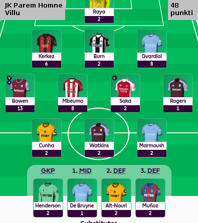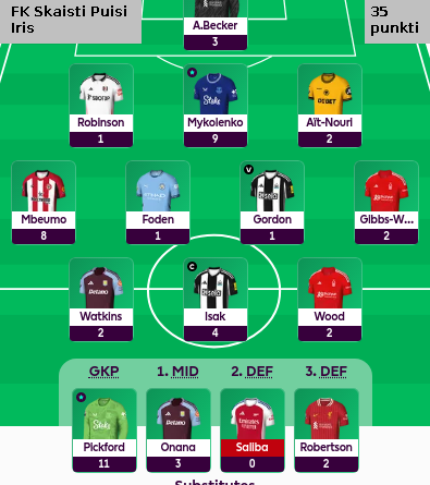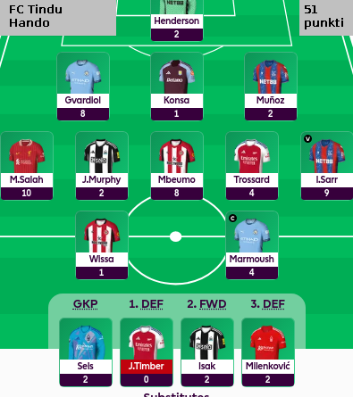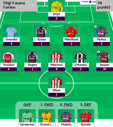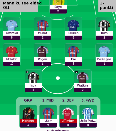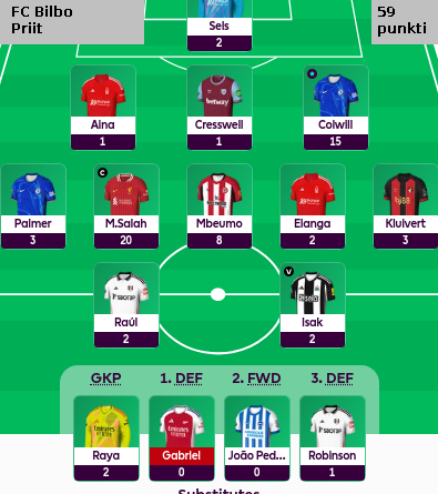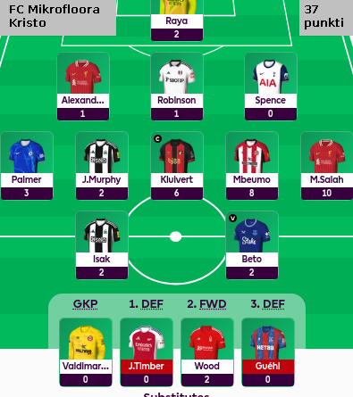 | JK Parem Homne (Villu) | transfer out: Saka (Arsenal), João Pedro (Brighton) | to bench: Watkins (Aston Villa), Muñoz (Crystal Palace), Saliba (Arsenal) | | transfer in: Mbeumo (Brentford), Cunha (Wolves) | from bench: Lewis (Man City), Burn (Newcastle) | | FC Bilbo (Priit) | transfer out: | to bench: João Pedro (Brighton), Robinson (Fulham) | | transfer in: | from bench: Aina (Nott'm Forest), Raúl (Fulham) | | FC Mikrofloora (Kristo) | transfer out: | to bench: J.Timber (Arsenal) | | transfer in: | from bench: Spence (Spurs) | | FK Skaisti Puisi (Iris) | transfer out: | to bench: Onana (Aston Villa), Robinson (Fulham), Saliba (Arsenal) | | transfer in: | from bench: Foden (Man City), Mykolenko (Everton), Robertson (Liverpool) | | Riia Dünamo (Margus) | transfer out: I.Sarr (Crystal Palace), Mateta (Crystal Palace), Marmoush (Man City) | to bench: Arrizabalaga (Bournemouth), Saliba (Arsenal), Saka (Arsenal) | | transfer in: Barnes (Newcastle), Strand Larsen (Wolves), Wissa (Brentford) | from bench: Flekken (Brentford), Milenković (Nott'm Forest), Raúl (Fulham) | | FC Hiromantika (Risto) | transfer out: Henderson (Crystal Palace), Gvardiol (Man City), Saliba (Arsenal), Rogers (Aston Villa), Saka (Arsenal), Eze (Crystal Palace), De Bruyne (Man City), Marmoush (Man City), Strand Larsen (Wolves), Watkins (Aston Villa), Martinez (Aston Villa), I.Sarr (Crystal Palace), Milenković (Nott'm Forest), J.Timber (Arsenal) | to bench: | | transfer in: A.Becker (Liverpool), Aït-Nouri (Wolves), Sessegnon (Fulham), B.Fernandes (Man Utd), M.Salah (Liverpool), Mbeumo (Brentford), Tonali (Newcastle), Isak (Newcastle), Wood (Nott'm Forest), Cunha (Wolves), Pope (Newcastle), Iwobi (Fulham), James (Chelsea), Huijsen (Bournemouth) | from bench: | | FC Nuckö (Hannes) | transfer out: Raya (Arsenal), Muñoz (Crystal Palace), Konsa (Aston Villa), Kiwior (Arsenal), Gvardiol (Man City), I.Sarr (Crystal Palace), Saka (Arsenal), Rogers (Aston Villa), Mateta (Crystal Palace), Marmoush (Man City), Watkins (Aston Villa), Areola (West Ham), J.Murphy (Newcastle), Burn (Newcastle) | to bench: | | transfer in: Pope (Newcastle), Trippier (Newcastle), Aït-Nouri (Wolves), Cucurella (Chelsea), Mbeumo (Brentford), Iwobi (Fulham), Palmer (Chelsea), Welbeck (Brighton), Isak (Newcastle), Cunha (Wolves), Bentley (Wolves), Kluivert (Bournemouth), Robinson (Fulham), Kerkez (Bournemouth) | from bench: M.Salah (Liverpool) | | FC Sigulda Kepp (Gaius) | transfer out: Raya (Arsenal), Muñoz (Crystal Palace), Saliba (Arsenal), Eze (Crystal Palace), Rogers (Aston Villa), Saka (Arsenal), Marmoush (Man City), Pope (Newcastle), Solanke (Spurs), Digne (Aston Villa) | to bench: | | transfer in: A.Becker (Liverpool), Sessegnon (Fulham), Barnes (Newcastle), Bowen (West Ham), Strand Larsen (Wolves), Cunha (Wolves), Leno (Fulham), Palmer (Chelsea), Bradley (Liverpool), Mykolenko (Everton) | from bench: Milenković (Nott'm Forest) | | Männiku tee eided (Ott) | transfer out: Raya (Arsenal), Gvardiol (Man City), J.Timber (Arsenal), Saliba (Arsenal), Muñoz (Crystal Palace), I.Sarr (Crystal Palace), Rogers (Aston Villa), Eze (Crystal Palace), De Bruyne (Man City), Marmoush (Man City), Watkins (Aston Villa), Martinez (Aston Villa) | to bench: | | transfer in: Arrizabalaga (Bournemouth), Aït-Nouri (Wolves), Alexander-Arnold (Liverpool), Trippier (Newcastle), Iwobi (Fulham), Barnes (Newcastle), Mbeumo (Brentford), Luis Díaz (Liverpool), Cunha (Wolves), Isak (Newcastle), Leno (Fulham), Sessegnon (Fulham) | from bench: M.Salah (Liverpool) | | Tiigi Fauna (Tarmo) | transfer out: Raya (Arsenal), Gvardiol (Man City), Muñoz (Crystal Palace), Savinho (Man City), Trossard (Arsenal), Mateta (Crystal Palace), Henderson (Crystal Palace), Konsa (Aston Villa), Rogers (Aston Villa), Marmoush (Man City) | to bench: Milenković (Nott'm Forest), M.Salah (Liverpool) | | transfer in: José Sá (Wolves), Aït-Nouri (Wolves), Schär (Newcastle), Iwobi (Fulham), Semenyo (Bournemouth), Mbeumo (Brentford), Wood (Nott'm Forest), Cunha (Wolves), Sánchez (Chelsea), Cucurella (Chelsea) | from bench: | | fc puuk (Lõks) | transfer out: Muñoz (Crystal Palace), De Bruyne (Man City), M.Asensio (Aston Villa), Marmoush (Man City), Dúbravka (Newcastle), Wan-Bissaka (West Ham), Aina (Nott'm Forest) | to bench: Verbruggen (Brighton), Kerkez (Bournemouth) | | transfer in: Flekken (Brentford), Alexander-Arnold (Liverpool), Cucurella (Chelsea), Barnes (Newcastle), B.Fernandes (Man Utd), Wood (Nott'm Forest), Milenković (Nott'm Forest) | from bench: | | FC Tindu (Hando) | transfer out: | to bench: Henderson (Crystal Palace), J.Timber (Arsenal), Trossard (Arsenal), Gvardiol (Man City) | | transfer in: | from bench: Sels (Nott'm Forest), Wissa (Brentford), Isak (Newcastle), Milenković (Nott'm Forest) | | Kuusalu SK Rada (Risto) | transfer out: | to bench: Gvardiol (Man City), Janelt (Brentford) | | transfer in: | from bench: Smith Rowe (Fulham), Wan-Bissaka (West Ham) |